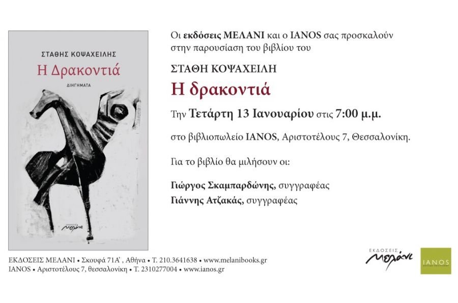 Οι εκδόσεις Μελάνι και ο IANOS παρουσιάζουν το νέο βιβλίο του Στάθη Κοψαχείλη με τίτλο “Η Δρακοντιά”. Θα μιλήσουν οι Γιώργος Σκαμπαρδώνης, συγγραφέας, Γιάννης Ατζακάς, συγγραφέας.
