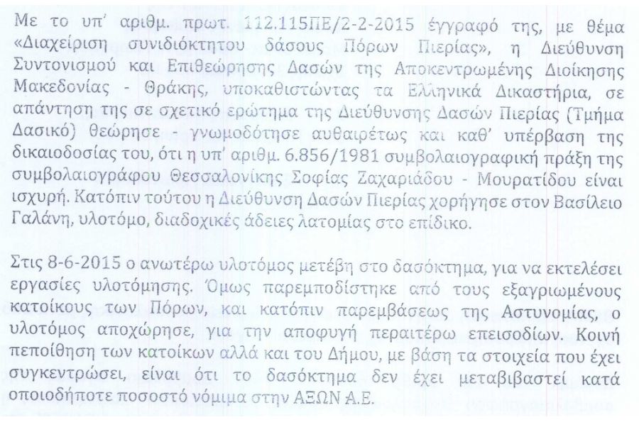Κάποιος ή κάποιοι πρέπει να εξηγήσουν (σ΄ αυτούς τους συνδημότες μας που κινητοποιούνται για να προστατεύσουν το δάσος, διακινδυνεύοντας συλλήψεις, παραπομπές και ίσως και καταδίκες) γιατί ενώ άλλοι έκαναν το περισσότερο, αυτοί δεν κάνουν το ελάχιστο. Ειδικά όταν το σημαντικότερο για την υπόθεση το είπε ήδη ο Δήμος Δίου-Ολύμπου και δεν χρειάζεται να το πει κανείς άλλος, ούτε να αποδώσει άλλος ευθύνες ή να εντοπίσει … παράξενες επιλογές αρμοδίων. Μπορείτε να το διαβάσετε στο απόσπασμα που ακολουθεί.