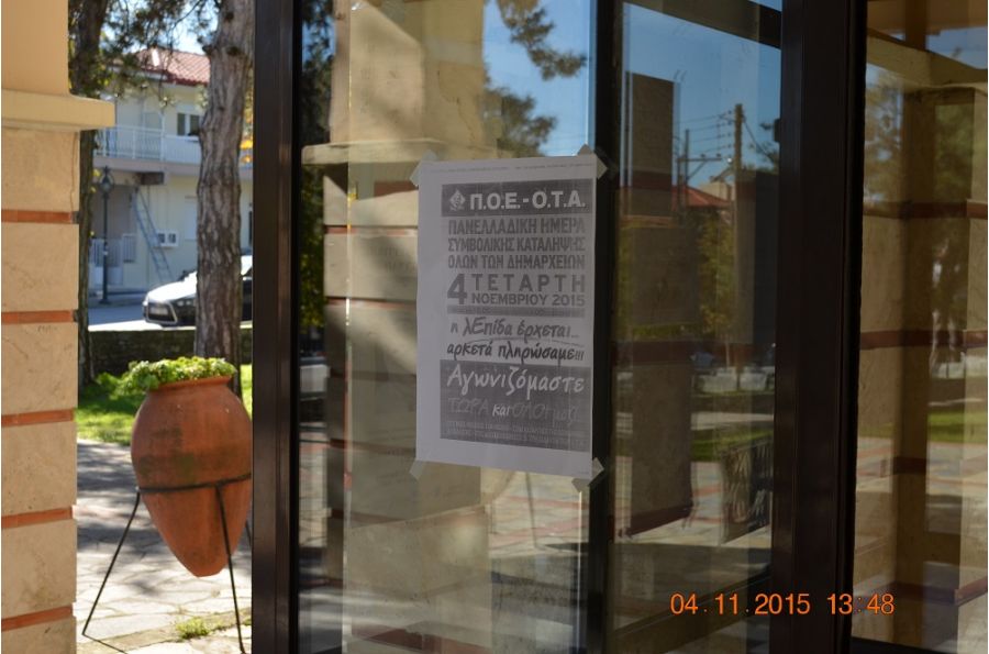 Οι εργαζόμενοι στην Τοπική Αυτοδιοίκηση δηλώνουμε αποφασισμένοι να συνεχίσουμε τον αγώνα, μαζικά και ενωτικά, κατά των πολιτικών που θέλει να επιβάλει η τρόικα και εφαρμόζει η συγκυβέρνηση στην Ελλάδα, εξυπηρετώντας εγχώρια και ξένα συμφέροντα. Η Τετάρτη 4 Νοεμβρίου 2015 έχει χαρακτηριστεί ως Πανελλαδική Ημέρα Κατάληψης όλων Δημαρχείων αλλά και υπηρεσιών όπως τα Δημοτικά Γκαράζ, τα Κ.Α.Π.Η. και οι Παιδικοί Σταθμοί.