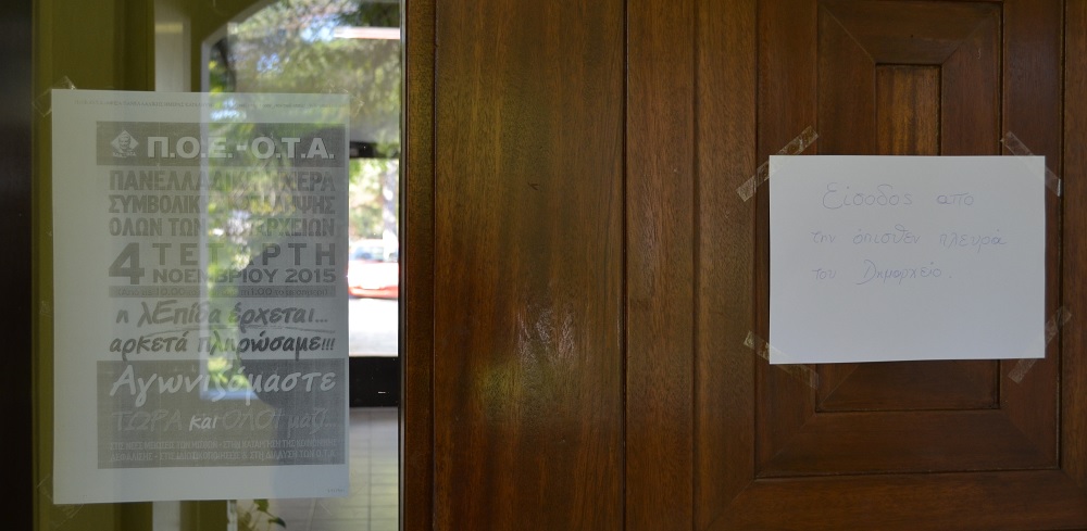Για τρείς ώρες, οι δημοτικοί υπάλληλοι της χώρας, καταλαμβάνουν ταυτόχρονα τα Δημαρχεία όλης της χώρας, την Τετάρτη 4.11.2015.