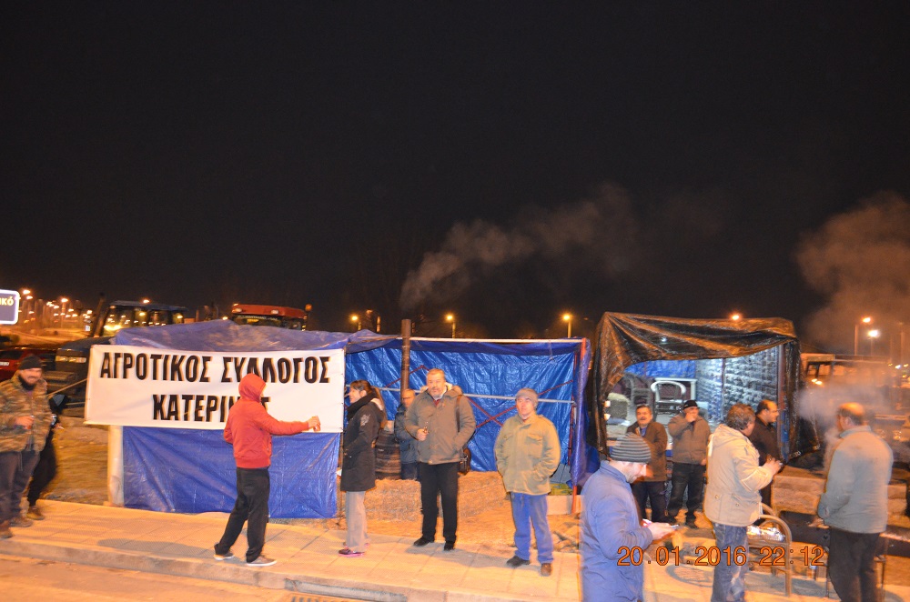Νωρίς το βράδυ της 20ης.1.2016 υπήρχαν στην Πιερία δυο μπλόκα, στις δυο εξόδους της πόλης προς βορρά και προς νότο. Δεν δημιουργήθηκε κανένα πρόβλημα, αφού οι αγρότες παραμένουν συγκεντρωμένοι με τα τρακτέρ στην άκρη των δρόμων. Ήδη έχει οργανωθεί η εκπροσώπηση όλων των κοινοτήτων και συλλόγων, με τη μορφή επιτροπής στην οποία μετέχει ένα μέλος ανά περιοχή.