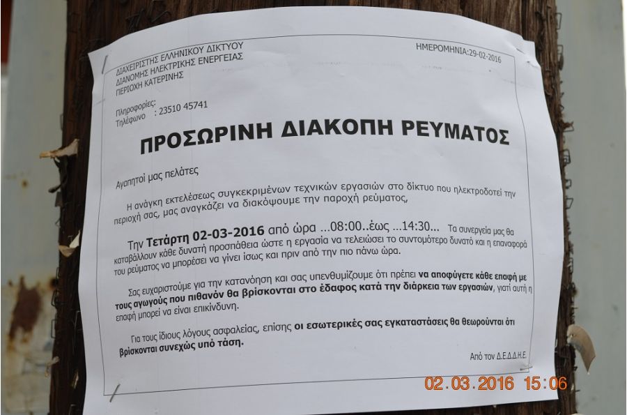Σε κολώνες της ηλεκτροδότησης και σε μετασχηματιστές εργάστηκαν τα συνεργεία της Δ.Ε.Δ.Δ.Η.Ε. και σε κολώνες επίσης υπήρχε και η μόνη ενημέρωση προς το κοινό και για τις ώρες διακοπής της ηλεκτροδότησης και τις επιβεβλημένες οδηγίες προς τους καταναλωτές, πχ ότι θα έπρεπε ακόμη και στη διάρκεια της διακοπής να ενεργούμε σαν να υπάρχει ηλεκτροδότηση στο δίκτυό μας. Άλλη ενημέρωση, … καμία.