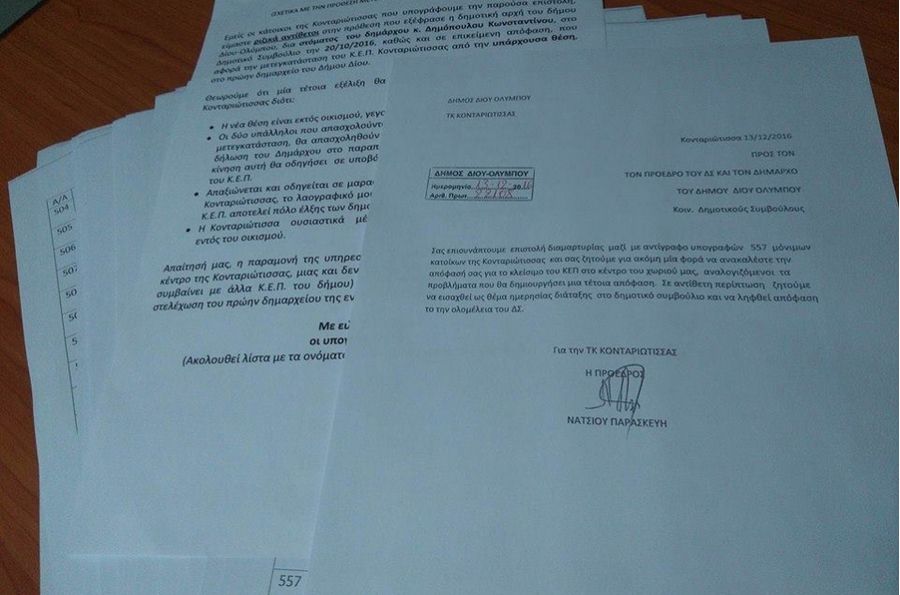 Κατέθεσα σήμερα 13/12/2016 την επιστολή διαμαρτυρίας συνοδευόμενη από 557 υπογραφές κατοίκων της Κονταριώτισσας που αντιτίθενται στην πρόθεση του δημάρχου κ.Δημόπουλου να κλείσει το Κ.Ε.Π. που βρίσκεται στο κέντρο του χωριού και να το μετεγκαταστήσει στο πρώην δημαρχείο της ενότητας του Δίου. Αίτημα μας η ανάκληση της απόφασης αυτής. Σε αντίθετη περίπτωση να εισαχθεί ως θέμα ημερήσιας διάταξης στο δημοτικό συμβούλιο για να ληφθεί απόφαση από την ολομέλεια.