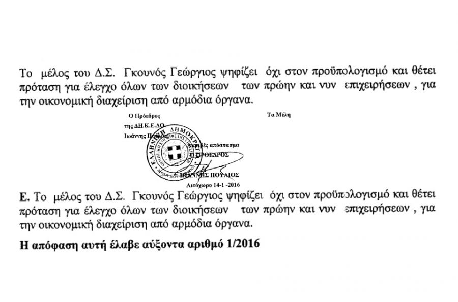 • Πριν την παραίτησή του στις 19.4.2017, ο Γκουνός ξαναψήφισε στην “Κατάρτιση και ψήφιση προϋπολογισμού 2017”. Όχι απλώς ψήφισε θετικά όπως και οι συνάδελφοί του στο ΔΣ, αλλά δεν έθεσε κανένα θέμα ελέγχου.                                                                                                                                                                                                                           7Ν7ΣΟΚΥΟ-9ΓΖ
