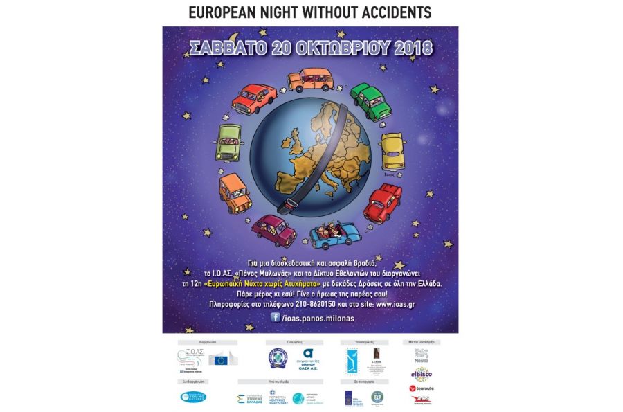 Με κεντρικό μήνυμα «το αλκοόλ και η οδήγηση δεν πάνε μαζί» το Ινστιτούτο Οδικής Ασφάλειας (Ι.Ο.ΑΣ.) «Πάνος Μυλωνάς» διοργανώνει το Σάββατο 20 Οκτωβρίου 2018 τη 12η «Ευρωπαϊκή Νύχτα χωρίς Ατυχήματα» σε 30 πόλεις της Ελλάδας.Η ενέργεια πραγματοποιείται, όπως κάθε χρόνο, ταυτόχρονα με τη μεγάλη Πανευρωπαϊκή διοργάνωση, με στόχο την ενημέρωση και ευαισθητοποίηση κοινού και οδηγών για τους κινδύνους της οδήγησης υπό την επήρεια αλκοόλ και στην κεντρική Μακεδονία τελεί υπό την αιγίδα της Περιφέρειας Κεντρικής Μακεδονίας.