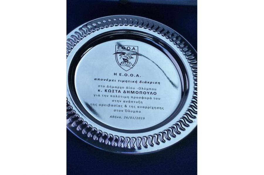 Στις 26 Ιανουαρίου 2019, ενόψει της ετήσια τακτικής γενικής συνέλευσης των μελών της Ελληνικής Ομοσπονδίας Ορειβασίας Αναρρίχησης που διεξήχθη στην Αθήνα, στο Ξενοδοχείο Τιτάνια, σε λαμπρή τελετή απονεμήθηκε τιμή στο Δήμαρχο Δίου – Ολύμπου Κώστα Δημόπουλο «για την προσφορά του στην ορειβασία και αναρρίχηση στον Όλυμπο».