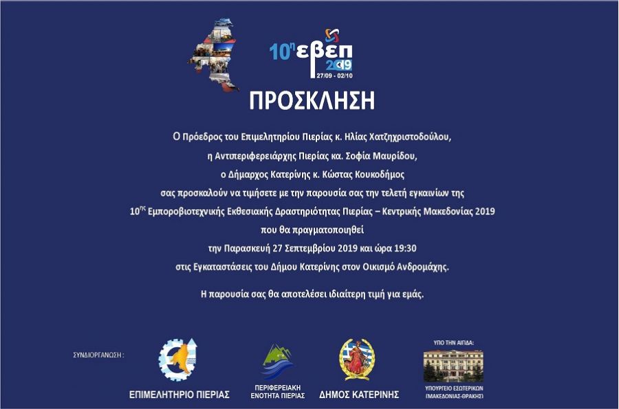 Το Επιμελητήριο Πιερίας, η Αντιπεριφέρεια Πιερίας, ο Δήμος Κατερίνης και οι Εκθέτες της Επετειακής 10ης ΕΒΕΠ-ΚΜ 2019, σας προσκαλούν να τους τιμήσετε με την παρουσία σας και όλοι μαζί να γιορτάσουμε τα 10 χρόνια ανοδικής πορείας και να γίνουμε συνεχιστές του πιο αγαπημένου θεσμού της Πιερίας, με μουσικές επιλογές, κεράσματα, δώρα και πολλές εκπλήξεις.