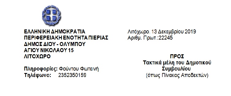 Καλείστε σε τακτική συνεδρίαση του Δημοτικού Συμβουλίου, στο Δημοτικό κατάστημα που εδρεύει στην Κοινότητα Λιτοχώρου, στις 18.12.2019, ημέρα Τετάρτη και ώρα 17:00, βάσει των διατάξεων του άρθρου 67 του Ν. 3852/2010 με τίτλο «Σύγκληση του Δημοτικού Συμβουλίου», για τη συζήτηση των παρακάτω θεμάτων της ημερήσιας διάταξης.