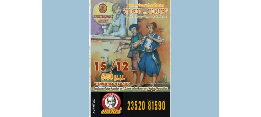 Κυριακή 15.12.2019, 6μμ, στην αίθουσα εκδηλώσεων του Α’ Δημοτικού Σχολείου Λιτοχώρου