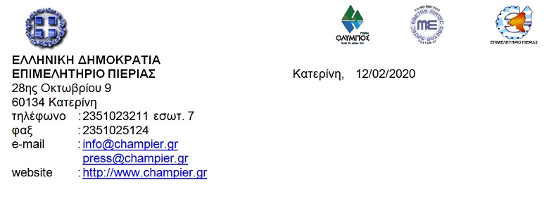 Εκ μέρους του Διοικητικού Συμβουλίου του Επιμελητηρίου Πιερίας εύχομαι καλή επιτυχία στα νέα του καθήκοντα και τον διαβεβαιώνω ότι η συνεργασία μας θα συνεχιστεί  και θα ενταθεί προς όφελος της ανάπτυξης του επιχειρείν και της ευημερίας του τόπου μας.
