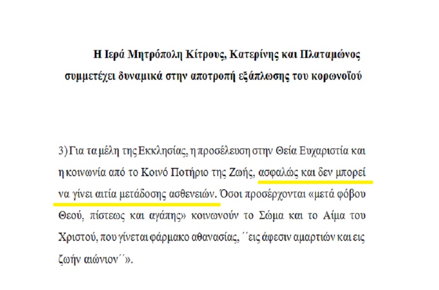 Οι οδηγίες της πολιτείας-προτάσεις των ειδικών επιστημόνων και των αρμόδιων οργάνων της και οι απόψεις της Εκκλησίας της Ελλάδας, συνδυάζονται σε ανακοίνωση της Μητρόπολης Κίτρους, Κατερίνης και Πλαταμώνος, στην οποία περιγράφονται πολλά πρακτικά μέτρα και επισημαίνεται ότι “το Κοινό Ποτήριο της Ζωής, ασφαλώς και δεν μπορεί να γίνει αιτία μετάδοσης ασθενειών”. Ασφαλώς.-