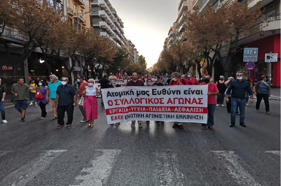Ιδιαίτερα μαζική ήταν η συγκέντρωση των συνδικάτων στο άγαλμα του Βενιζέλου καθώς και η πορεία που ακολούθησε μέχρι τη ΔΕΘ.