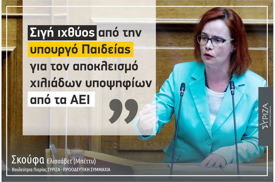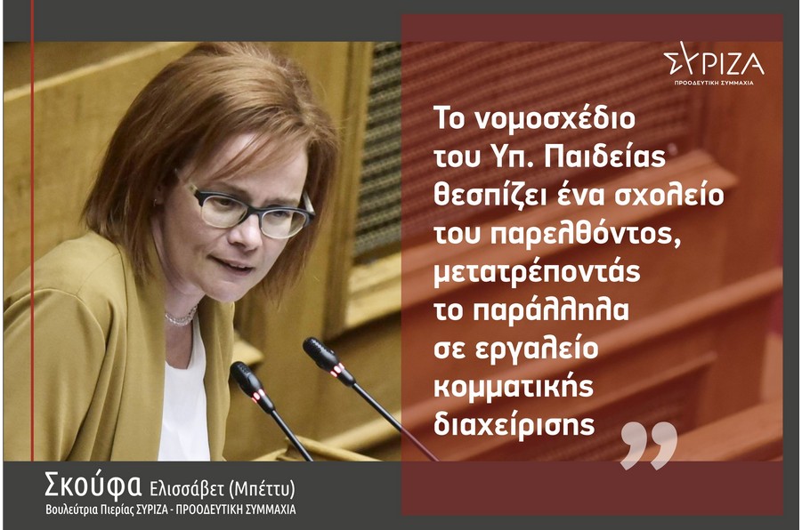 Με σκληρή γλώσσα αναφέρθηκε η βουλεύτρια Πιερίας ΣΥΡΙΖΑ- ΠΣ Ελισσάβετ (Μπέττυ) Σκούφα, στο νομοσχέδιο του υπουργείου Παιδείας με τίτλο «Αναβάθμιση του σχολείου, ενδυνάμωση των εκπαιδευτικών και άλλες διατάξεις». Στην ομιλία της, στην Ολομέλεια της Βουλής η κα Σκούφα άσκησε σφοδρή κριτική τόσο στο νομοσχέδιο το οποίο χαρακτήρισε «αντιεκπαιδευτικό» και «αντιπαιδαγωγικό», όσο και στη διαχείριση από την κυβέρνηση μιας σειράς κρίσιμων και σοβαρών ζητημάτων. Έργα και ημέρες της ΝΔ των τελευταίων δυο χρόνων, που όπως χαρακτηριστικά τόνισε η βουλεύτρια, ελάχιστοι από τους ψηφοφόρους της θα πίστευαν ότι θα κατάφερνε το συγκεκριμένο κόμμα και η συγκεκριμένη κυβέρνηση να αποδομήσει τόσες πολλές κοινωνικές και οικονομικές κατακτήσεις, διαφημίζοντας παράλληλα διά της μεθόδου του “αντεστραμμένου καθρέφτη” ότι καταφέρνει τόσα πολλά και φιλολαϊκά.