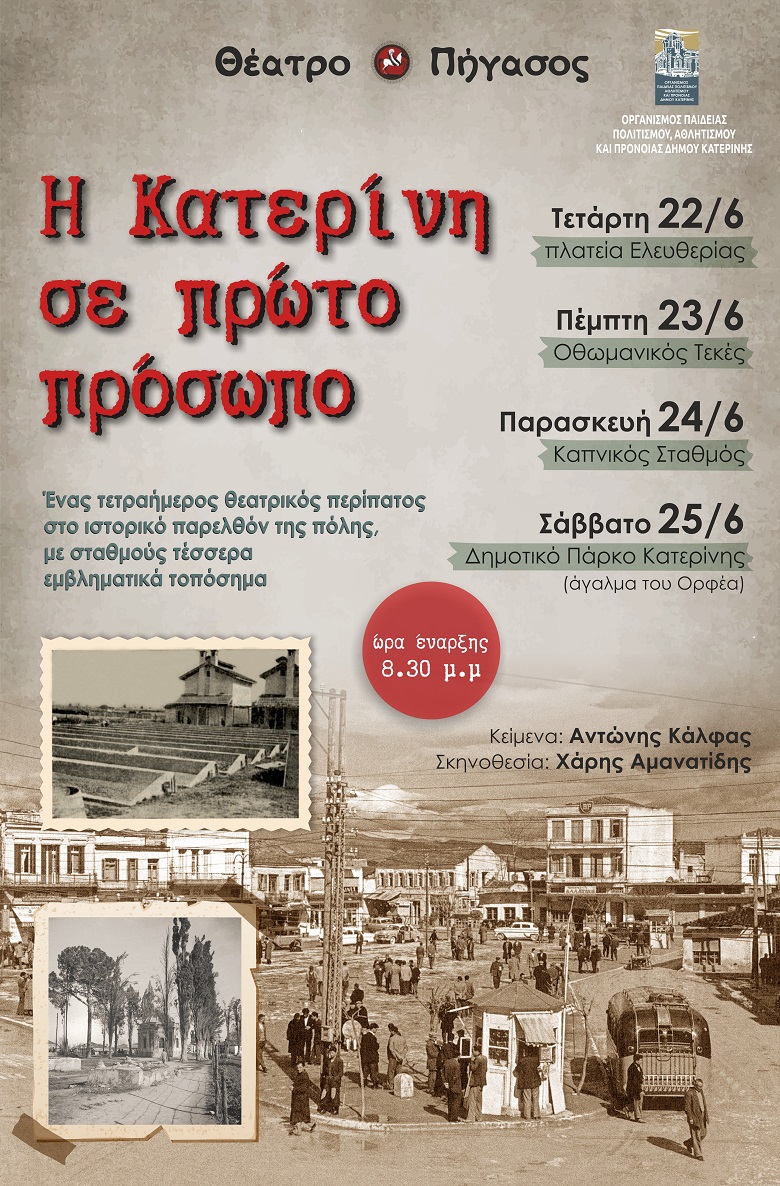 Έναν τετραήμερο θεατρικό περίπατο στο ιστορικό παρελθόν της πόλης παρουσιάζει το θέατρο ΠΗΓΑΣΟΣ, στο πλαίσιο των καλοκαιρινών πολιτιστικών εκδηλώσεων του Οργανισμού Πολιτισμού (ΟΠΠΑΠ) του Δήμου Κατερίνης.