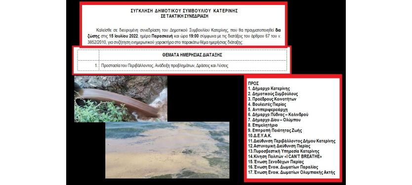 σύσσωμη η Πιερία, για πρώτη φορά, συζητά τα περιβαλλοντικά της, την Παρασκευή 15.7.2022, στο Δημοτικό Συμβούλιο Κατερίνης, με θέμα “Προστασία του Περιβάλλοντος, Ανάδειξη προβλημάτων, Δράσεις ΚΑΙ Λύσεις”