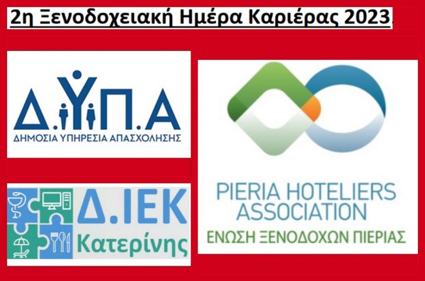 Η Ένωση Ξενοδόχων Πιερίας με την ΕΠΑΣ ΔΥΠΑ (πρώην ΟΑΕΔ) Κατερίνης και το Δημόσιο ΙΕΚ Κατερίνης συνδιοργανώνουν την 2η Ξενοδοχειακή Ημέρα Καριέρας 2023. Η εκδήλωση θα πραγματοποιηθεί την Τετάρτη 8 Φεβρουαρίου 2023 από τις 10:30 μέχρι τις 15:00 στο αμφιθέατρο της ΕΠΑΣ ΟΑΕΔ Κατερίνης. (τέρμα Τ. Τερζοπούλου, Κατερίνη. 23510-35165) και τελεί υπό την ενεργή στήριξη του Πιερικού Οργανισμού Τουριστικής Ανάπτυξης και Προβολής (ΠΟΤΑΠ).