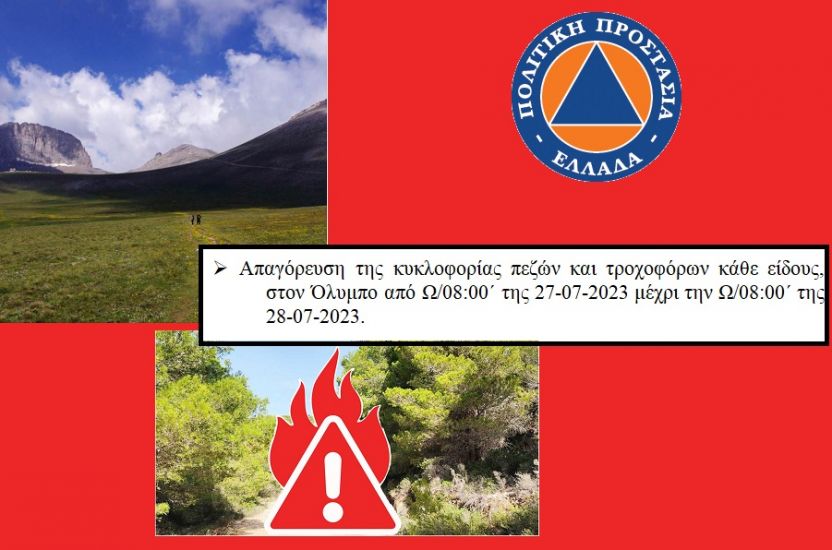 Ø Απαγόρευση της κυκλοφορίας πεζών και τροχοφόρων κάθε είδους, στον Όλυμπο από Ω/08:00΄ της 27-07-2023 μέχρι την Ω/08:00΄ της 28-07-2023.