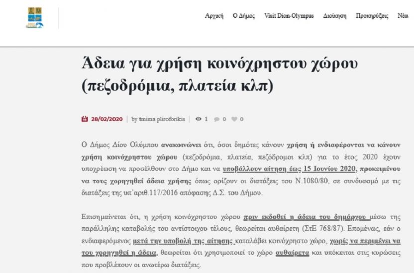 Δήμος Δίου-Ολύμπου | Ανακοίνωση: Τελική παράταση προθεσμίας έκδοσης και ανανέωσης αδειών κοινοχρήστων χώρων για τοποθέτηση τραπεζοκαθισμάτων και εμπορευμάτων