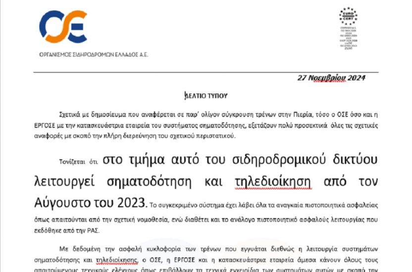 Σχετικά με δημοσίευμα που αναφέρεται σε παρ’ ολίγον σύγκρουση τρένων στην Πιερία, τόσο ο ΟΣΕ όσο και η ΕΡΓΟΣΕ με την κατασκευάστρια εταιρεία του συστήματος σηματοδότησης, εξετάζουν πολύ προσεκτικά όλες τις σχετικές αναφορές με σκοπό την πλήρη διερεύνηση του σχετικού περιστατικού.