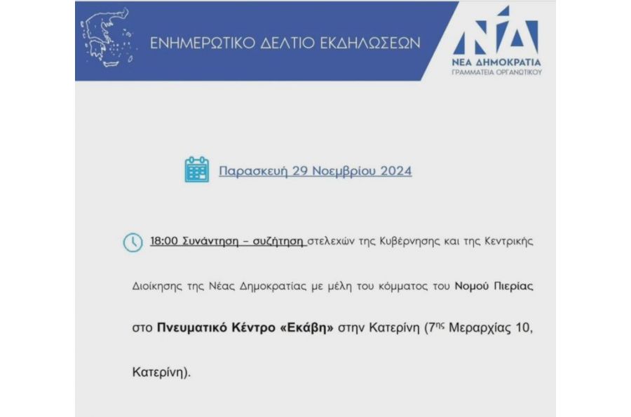 Ένας μικρός κυβερνητικός στρατός “αποβιβάζεται” αύριο στην Κατερίνη για να παρουσιάσει στους αρμόδιους τοπικούς υπηρεσιακούς φορείς και παράγοντες, το κοινό και τα κομματικά στελέχη, τα σχέδια της κυβέρνησης Μητσοτάκη για την Περιφερειακή Ενότητα Πιερίας, στο πλαίσιο της Περιφερειακής Ανάπτυξης.