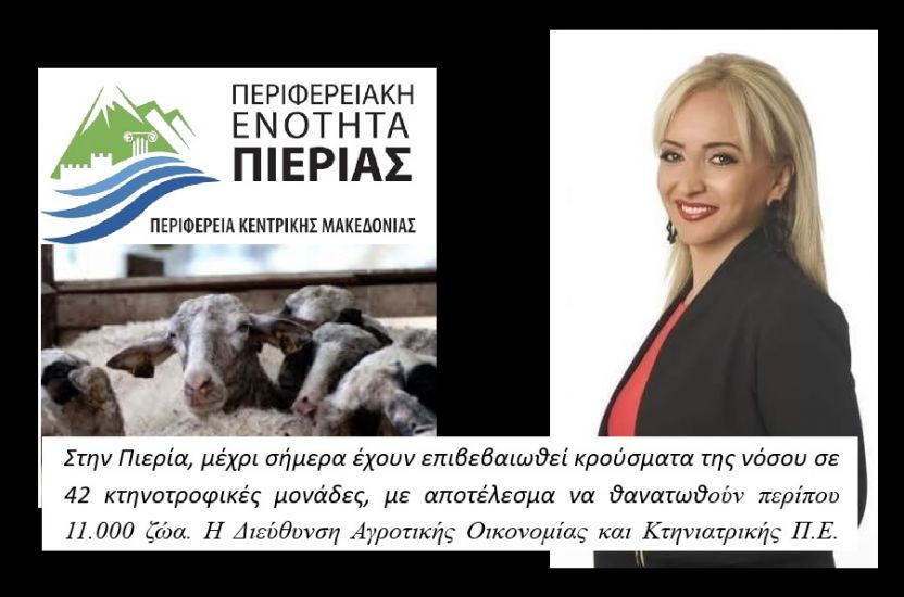 Στην Πιερία, μέχρι σήμερα έχουν επιβεβαιωθεί κρούσματα της νόσου σε 42 κτηνοτροφικές μονάδες, με αποτέλεσμα να θανατωθούν περίπου 11.000 ζώα. Η Διεύθυνση Αγροτικής Οικονομίας και Κτηνιατρικής Π.Ε. Πιερίας και το αρμόδιο Τμήμα Κτηνιατρικής σε απόλυτη συμμόρφωση με την Κοινοτική και Εθνική Νομοθεσία, εφαρμόζουν με αυστηρότητα όλα τα προβλεπόμενα μέτρα για τον περιορισμό και την εξάλειψη της νόσου και δεν είναι δυνατή οποιαδήποτε παρέκκλιση από το ισχύον νομικό πλαίσιο.