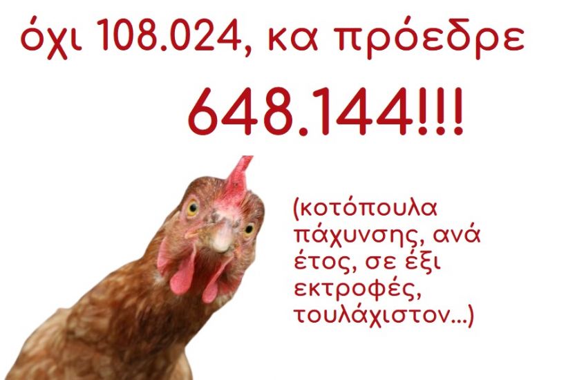 κοτόπουλων πάχυνσης ανά εκτροφή”. Κι αυτό γιατί αν η δυναμικότητα περιγράφεται “ανά εκτροφή” κι οι πολίτες πρέπει να έχουν την πραγματική εικόνα του μεγέθους και της δυναμικότητας, πρέπει -αν η δυναμικότητα περιγράφεται ανά εκτροφή, να φαίνεται και ο αριθμός των εκτροφών, ανά έτος. Γιατί είναι άλλο το 108.024 και πολύ διαφορετικό το 648.144. Κι όπως και η μελέτη του έργου βεβαιώνει, οι εκτροφές ανά έτος είναι έξι -6-, τουλάχιστον.
