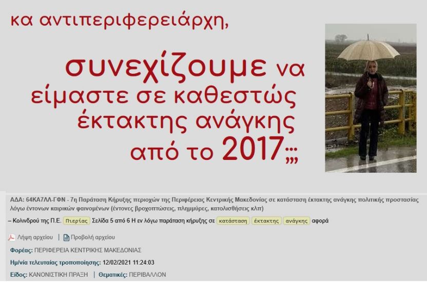 Από την αναποτελεσματική έρευνά μου προκύπτει ότι, μετά την 7η κατά σειρά παράταση του καθεστώτος έκτακτης ανάγκης, στο οποίο υπάχθηκε η Πιερία (κι άλλες, πολλές περιοχές της Περιφέρειας Κεντρικής Μακεδονίας) το 2021, … σταμάτησε η αρίθμηση των αποφάσεων παράτασης και -με δεδομένο το άπειρο των αποφάσεων που υπάρχουν στο ΔΙΑΥΓΕΙΑ- είναι εξαιρετικά δύσκολο να εντοπίσει κανείς αν συνεχίζει να ισχύει το καθεστώς αυτό κι αν ναι, για ποιους λόγους και σε ποιες περιοχές ακριβώς.