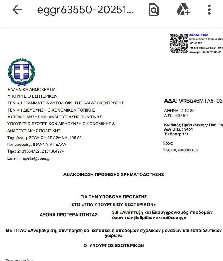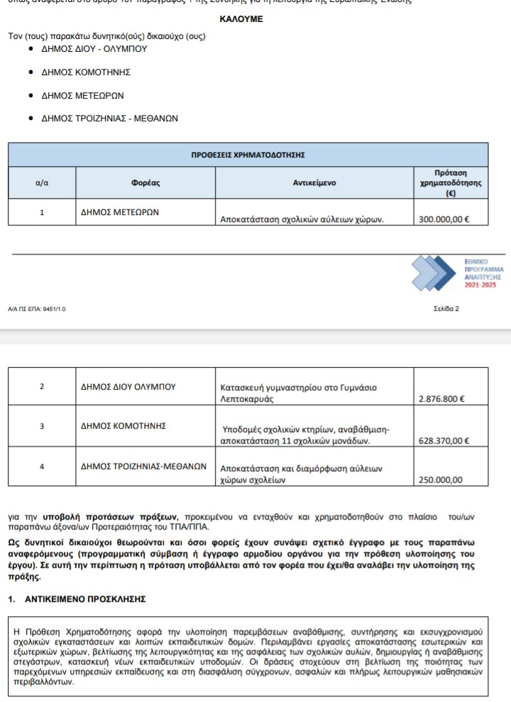 Το πρόγραμμα, λοιπόν, στο οποίο θα ενταχθεί έχει τίτλο “αναβάθμιση, συντήρηση και κατασκευή υποδομών σχολικών μονάδων και εκπαιδευτικών χώρων“.