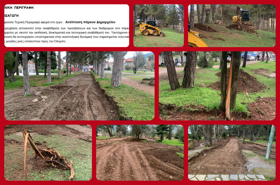 Ενώ οι εργασίες ξεκίνησαν πριν δύο βδομάδες -τουλάχιστον- και με μόλις 228 λέξεις, η διοίκηση του Δήμου Δίου-Ολύμπου ανακοίνωσε χθες, με τον συνηθισμένο πανηγυρικό τρόπο, την υλοποίηση του έργου «Ανάπλαση Δημοτικού Πάρκου Λιτοχώρου», προϋπολογισμού 1,5 εκατομμυρίων ευρώ «και συγχρηματοδότηση από την Περιφέρεια Κεντρικής Μακεδονίας και την Ευρωπαϊκή Ένωση (ΕΣΠΑ 2021-2027)».