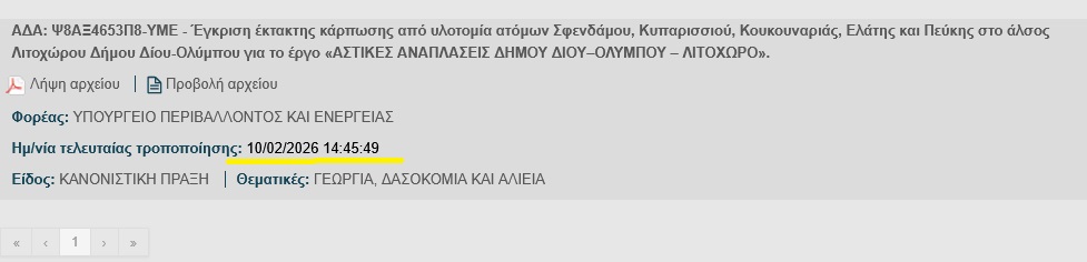 Δύο ώρες, 14 λεπτά και 11 δευτερόλεπτα πριν ο δήμαρχος Δίου-Ολύμπου, Βαγγέλης Γερολιόλιος, ενημερώσει για πρώτη φορά το Δημοτικό Συμβούλιο και τους δημότες/πολίτες/όποιον ενδιαφερόμενο για το έργο που ήδη υλοποιούνταν και υλοποιείται στο Πάρκο Λιτοχώρου (ανάπλαση), η Διεύθυνση Δασών Πιερίας δημοσίευε στο ΔΙΑΥΓΕΙΑ ένα έγγραφο/απόφασή της με τίτλο “Έγκριση έκτακτης κάρπωσης από υλοτομία ατόμων Σφενδάμου, Κυπαρισσιού, Κουκουναριάς, Ελάτης και Πεύκης στο άλσος Λιτοχώρου Δήμου Δίου-Ολύμπου για το έργο «ΑΣΤΙΚΕΣ ΑΝΑΠΛΑΣΕΙΣ ΔΗΜΟΥ ΔΙΟΥ–ΟΛΥΜΠΟΥ – ΛΙΤΟΧΩΡΟ”.
