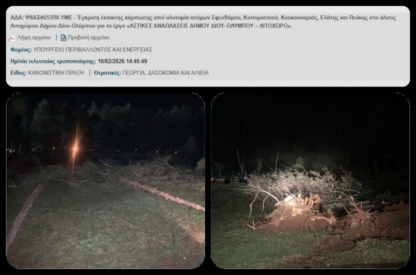Δύο ώρες, 14 λεπτά και 11 δευτερόλεπτα πριν ο δήμαρχος Δίου-Ολύμπου, Βαγγέλης Γερολιόλιος, ενημερώσει για πρώτη φορά το Δημοτικό Συμβούλιο και τους δημότες/πολίτες/όποιον ενδιαφερόμενο για το έργο που ήδη υλοποιούνταν και υλοποιείται στο Πάρκο Λιτοχώρου (ανάπλαση), η Διεύθυνση Δασών Πιερίας δημοσίευε στο ΔΙΑΥΓΕΙΑ ένα έγγραφο/απόφασή της με τίτλο “Έγκριση έκτακτης κάρπωσης από υλοτομία ατόμων Σφενδάμου, Κυπαρισσιού, Κουκουναριάς, Ελάτης και Πεύκης στο άλσος Λιτοχώρου Δήμου Δίου-Ολύμπου για το έργο «ΑΣΤΙΚΕΣ ΑΝΑΠΛΑΣΕΙΣ ΔΗΜΟΥ ΔΙΟΥ–ΟΛΥΜΠΟΥ – ΛΙΤΟΧΩΡΟ”.