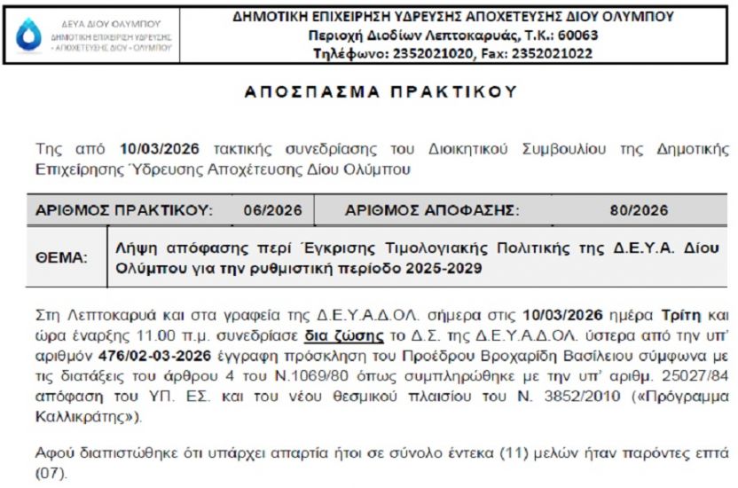 Στις 11.33 σήμερα το πρωί, δημοσιεύτηκε στο ΔΙΑΥΓΕΙΑ το νέο τιμολόγιο της Δημοτικής Επιχείρησης Ύδρευσης-Αποχέτευσης Δίου Ολύμπου, για την περίοδο 2025-2029.Η απόφαση του ΔΣ πάρθηκε σε συνεδρίαση από την οποία απουσίασαν τέσσερα μέλη του ΔΣ, δύο της διοίκησης και δύο της αντιπολίτευσης (οι Ζτάνης Ζουρζούρα, Γκρίνιας και Νούλα).