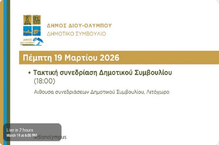 Πρόσκληση στην τακτική συνεδρίαση του Δημοτικού Συμβουλίου Δίου-Ολύμπου την Πέμπτη 19 Μαρτίου 2026 & θέματα ημερήσιας διάταξης